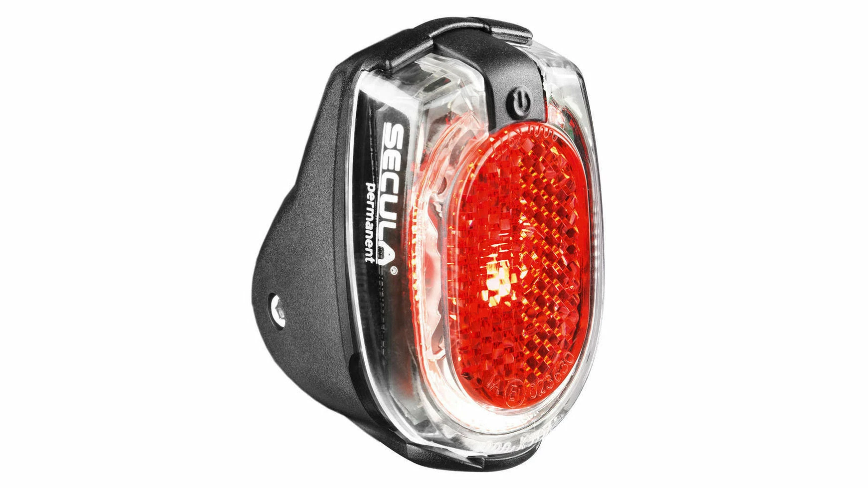 B&M Secula permanent mit LineTec-Technologie – Das LineTec-Prismensystem mit seiner eleganten Klarglas-Optik ist als Kranz um den Rückstrahler gelegt. Es leuchten rote Lichtkreise strahlend hell. Die aktive Signalisationsfläche ist extrem groß, obwohl das Rücklicht in der Form selbst äußerst zierlich ist.