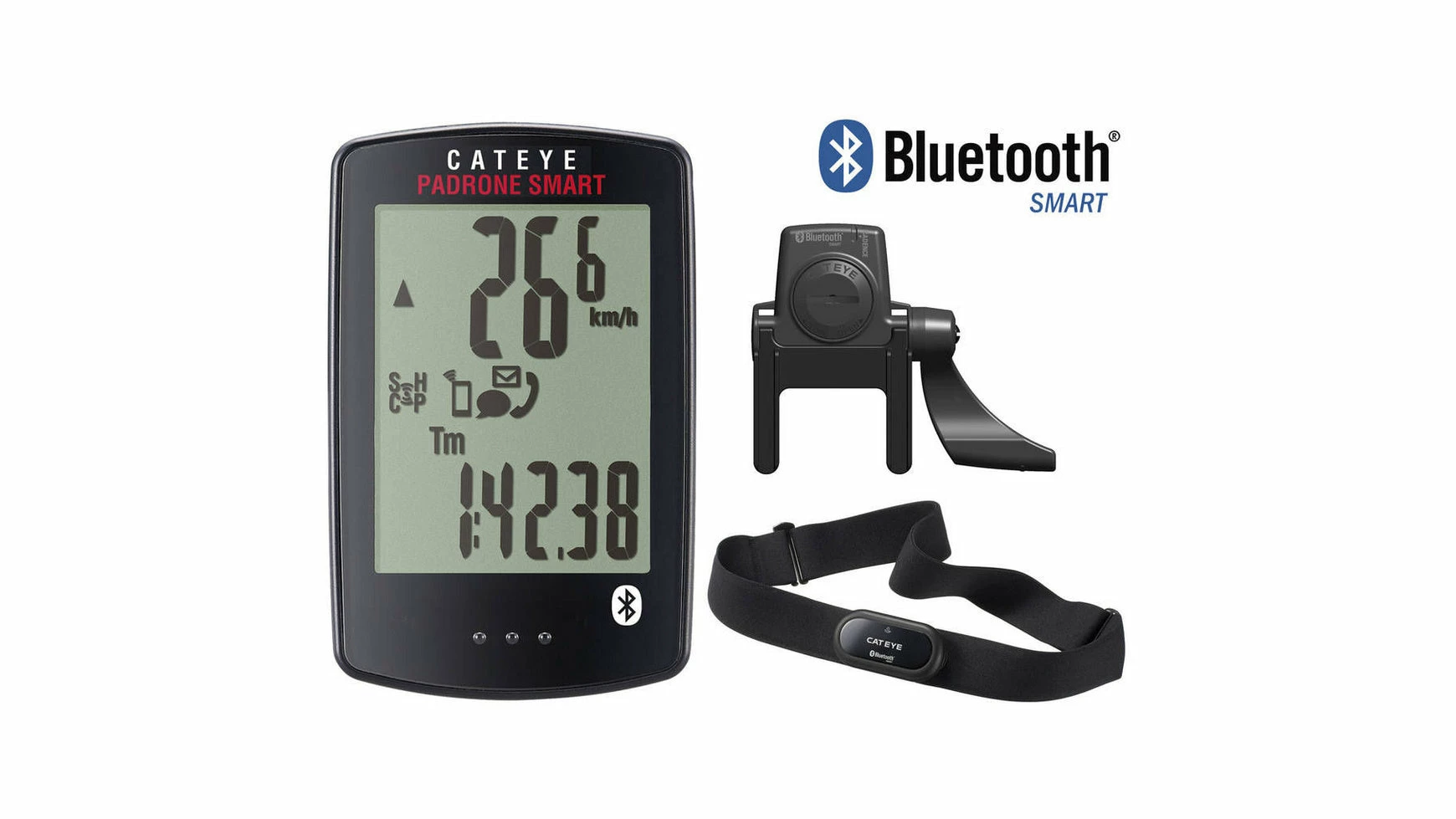 Nun mit einem Riesigen Display, ist der Padrone Smart das zweite Mitglied der Smart Familie. Nicht nur, dass er die Daten und Funktionen der Smartphone-Apps per Bluetooth 4.0 am Display wiederspiegelt und eingehende Anrufe oder Nachrichten anzeigt dieser Computer arbeitet auch vollkommen autark, falls das Smartphone beim rennen oder starken „Schlammschlachten“ mal nicht mit darf. Dadurch sind die Sorgen um die Akkulaufzeit des Smartphones Geschichte und es können jede Menge Kilometer abgespult und auf dem Padrone Smart zwischengespeichert werden. Lass dir an diesem super kleinen Display außergewöhnliche Funktionsvielfalt individuell auf dich abgestimmt anzeigen. Ob du mit evtl. Bluetooth-Sensoren nach Puls, Trittfrequenz oder gar Leistungsdaten fährst, die Durchschnittsgeschwindigkeit immer im Blick haben willst oder die Höhendaten dein Focus sind. Auf dem personalisierbarenDisplay bestimmst du, was angezeigt wird. So kann die Funktionsvielfalt eines GPS-Trainingscomputers mit der einfachen Bedienung und Bauweise unserer ClickTec verschmelzen. Deine Touren sind mit CATEYE Cycling App noch auf dem Rad mit einem Touch auf Strava.com oder gar TrainingPeaks.com hochgeladen spätestens dort entgeht dir kein Detail des Trainings oder der Tour. Komm mit in die Zukunft mit dem Padrone Smart!