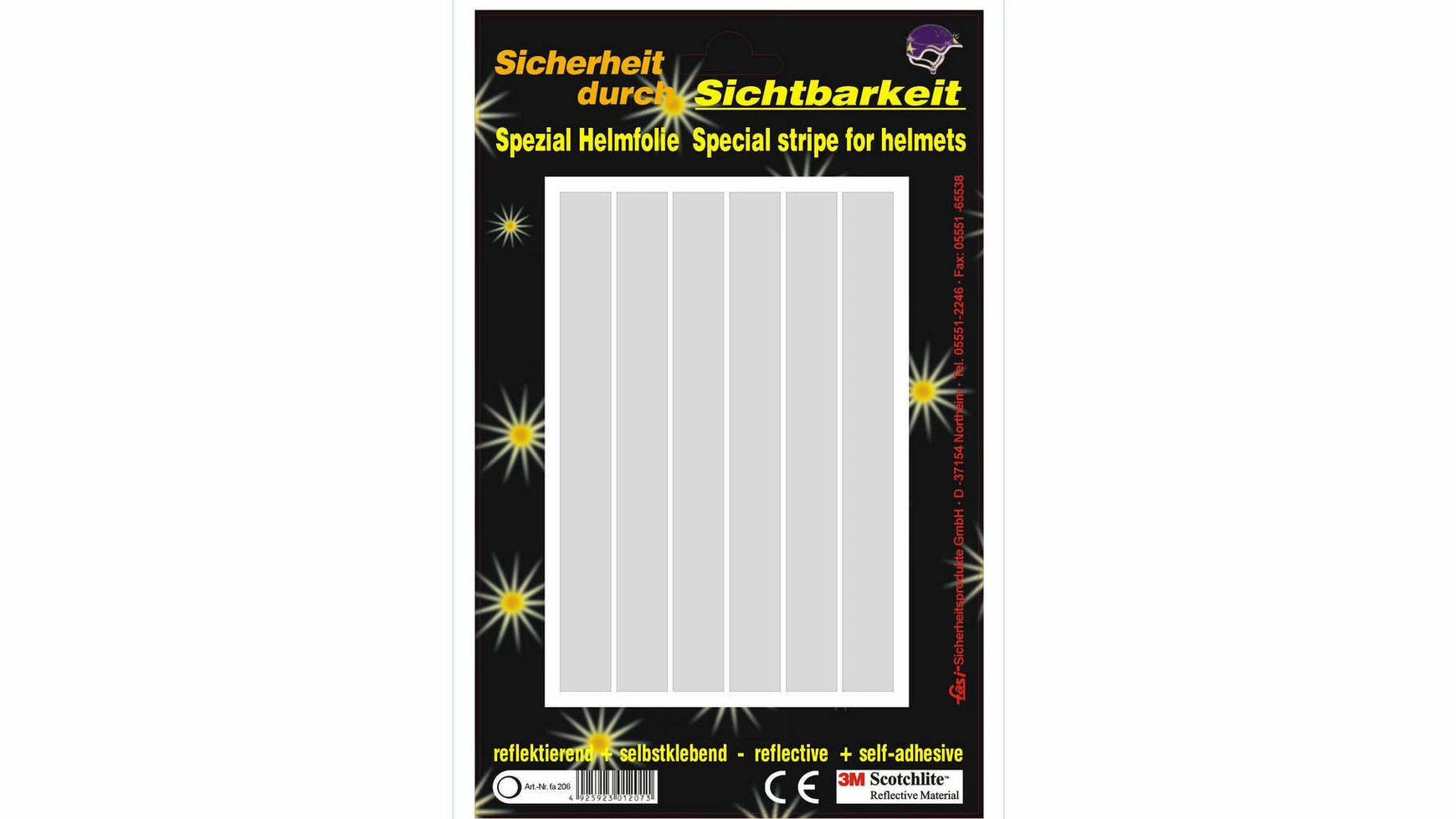 Spezial Helmfolie aus 3M Scotchlite Reflexmaterial. Der Spezialkleber greift die Schale des Helmes nicht an. 6 Streifen können sie rund um den Helm verteilen so das sie optimal zu sehen sind.