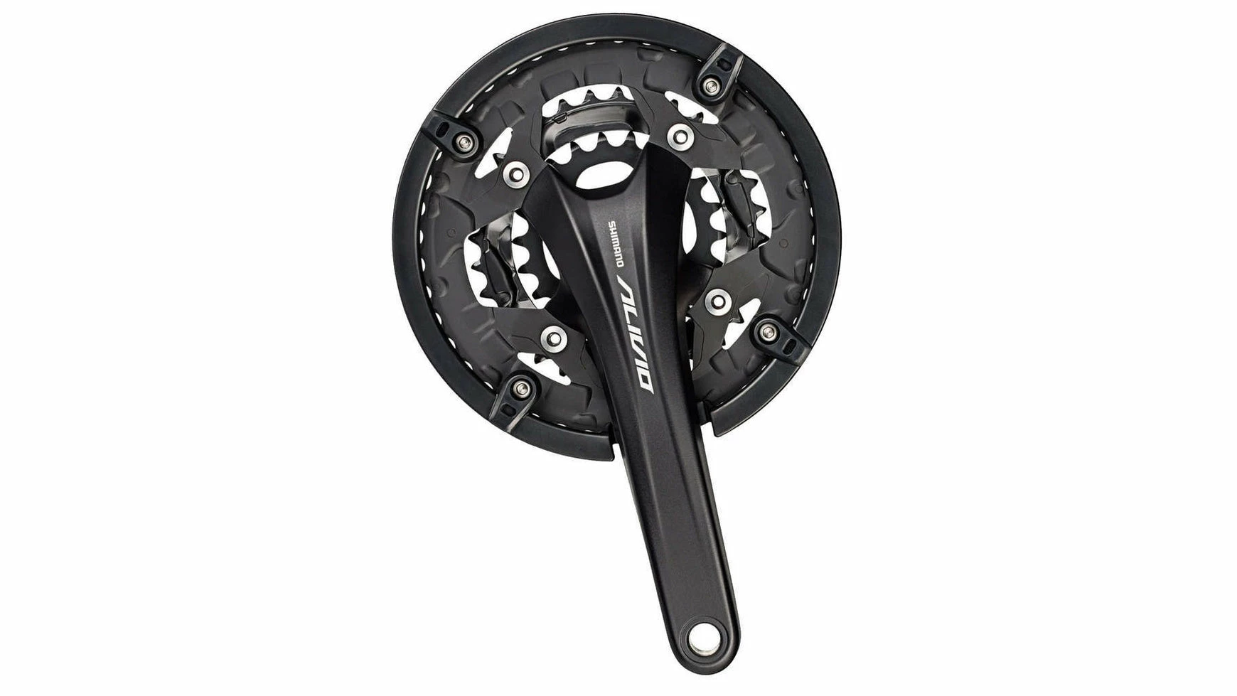 Alivio FC-T4060 Trekking Kurbelgarnitur für integrierte Innenlager. Mit Kettenschutzring sowie Hyperdrive SG-X Kettenblättern. Der Kurbelarm ist zweiteilig und besteht aus Aluminium, die auswechselbaren Kettenblätter aus Stahl. Dank Antirost-Verfahren werden die Kettenblätter vor äußeren Einflüssen geschützt und die Lebensdauer bei guter Pflege verlängert.