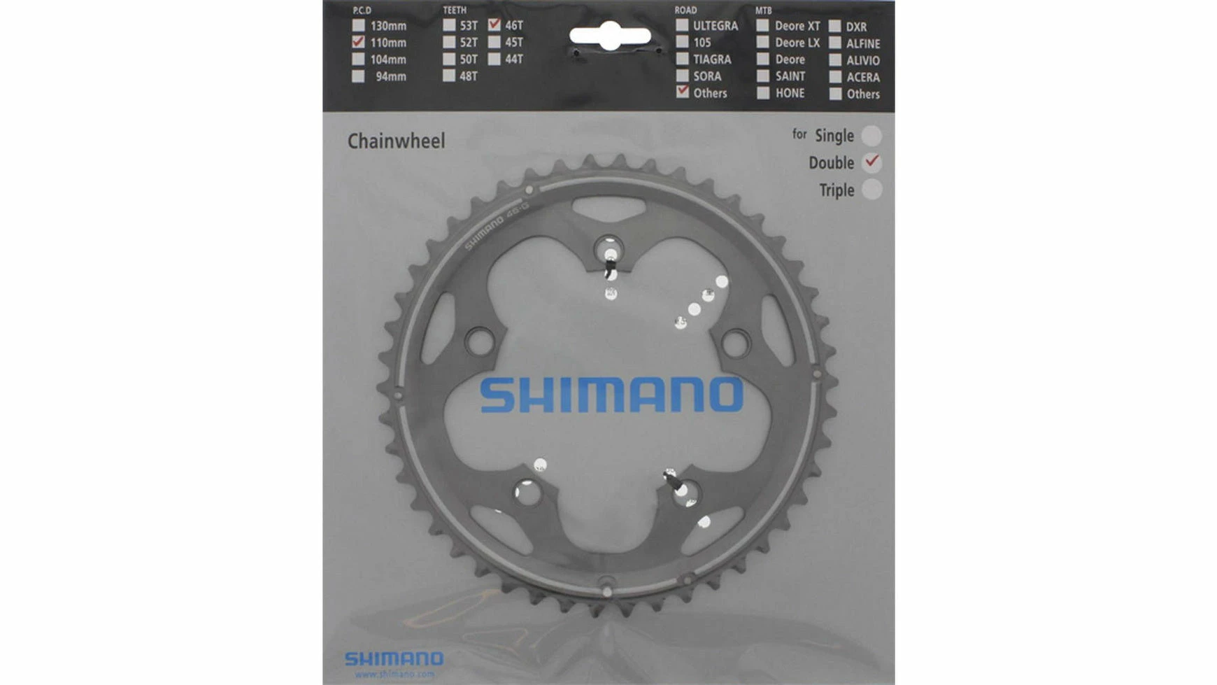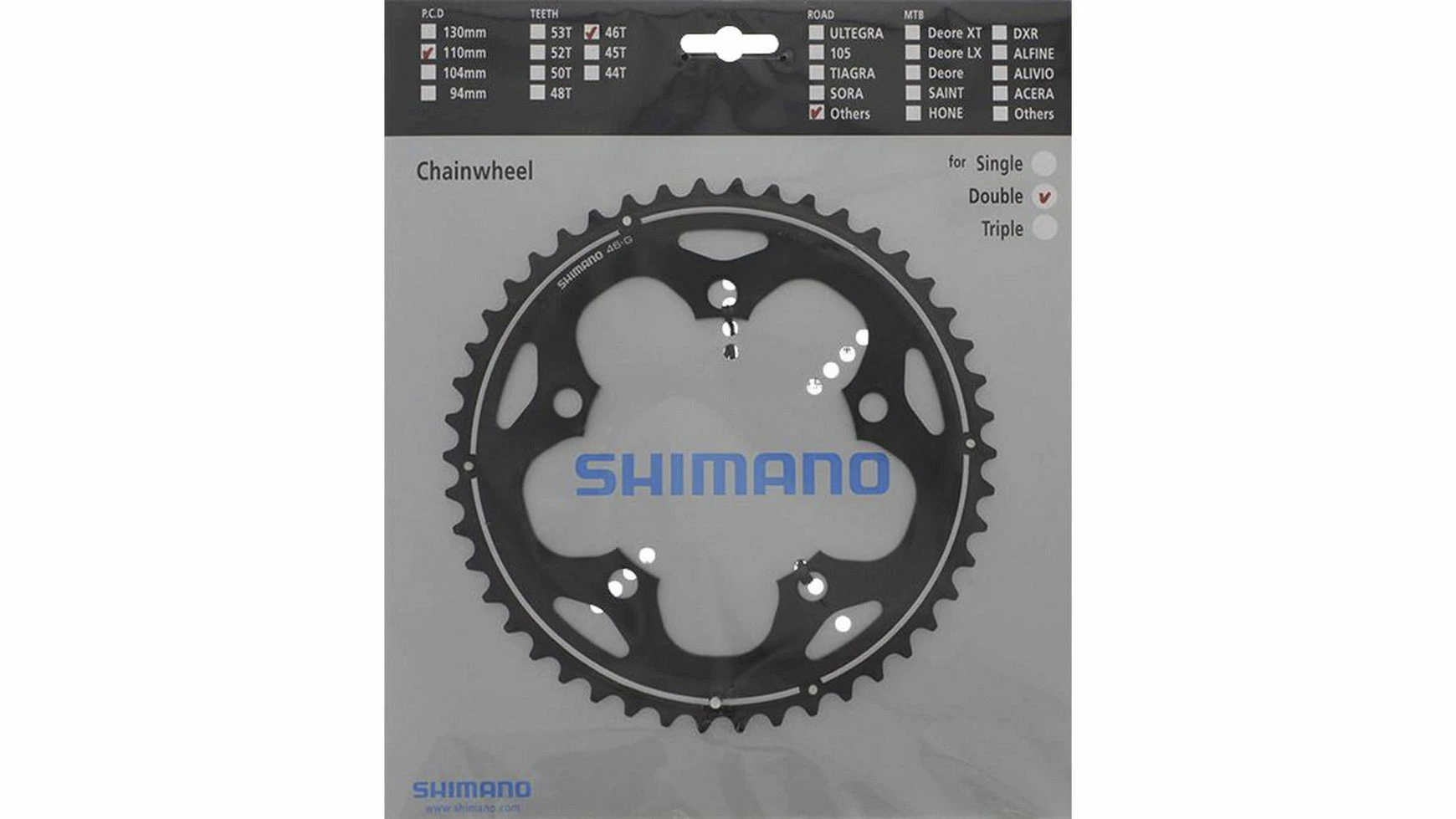Das Original Shimano Ersatzkettenblatt bietet Ihnen hohe Sicherheit und Zuverlässigkeit. Mit dem Shimano Kettenblatt Road FC-CX50 erreichen Sie einen optimalen Antrieb der Fahrradkette. Mit 46 Zähnen und einem Lochkreis von 110mm ist dieses äußere besonders leichte Aluminium Kettenblatt für alle 10-fach Fahrradketten ausgelegt und eignet sich für Zweifachkurbeln.